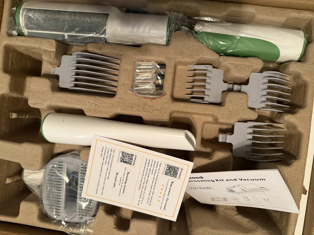 The kit comes with a variety of attachments, including a grooming brush to remove loose fur, a de-shedding tool to reduce shedding, an electric clipper for trimming, and a flat suction rod for cleaning up hair from furniture and floors.