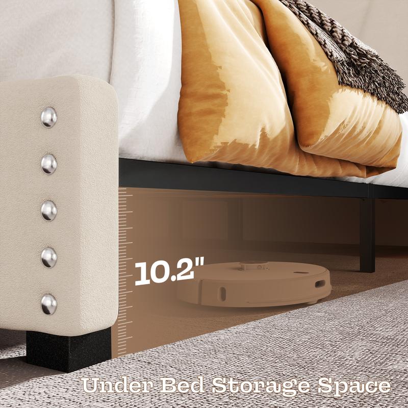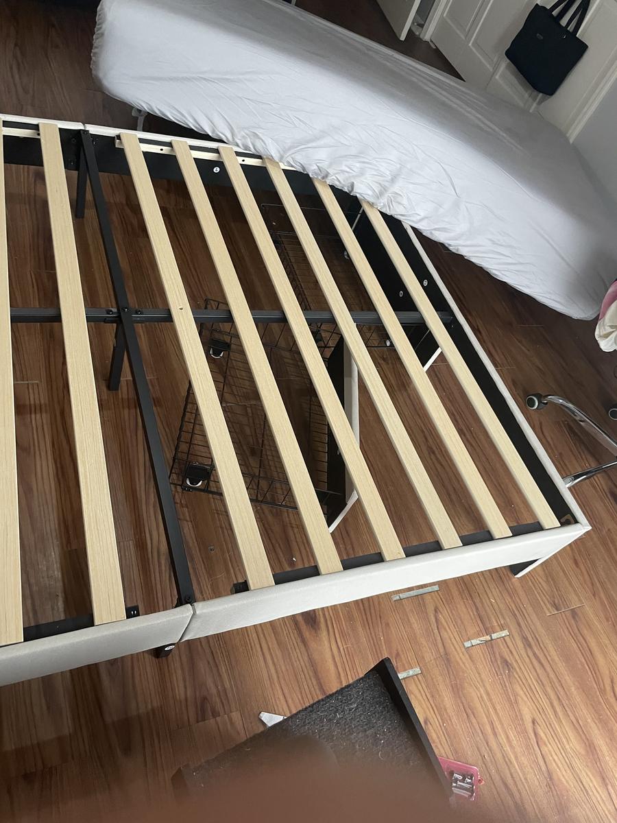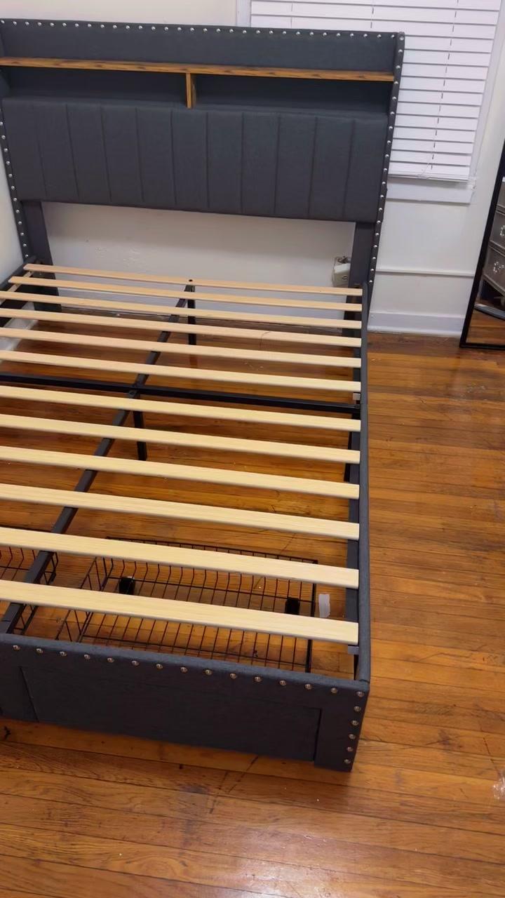 On the queen bed frame with storage we made a mute sponge strip design, and we used the pasting method to fastened the supporting wooden slats to effectively prevent the bed frame from creaking, our full size bed frame ensure your healthy sleep.