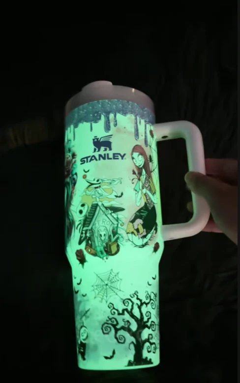 The tumbler is recommended to be hand washed only. Avoid using harsh dishwashing detergents and refrain from placing it in the dishwasher, especially with hot water, to maintain its glow-in-the-dark properties and overall appearance.